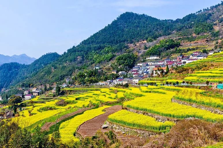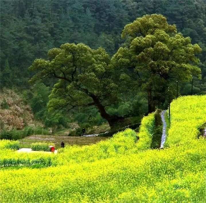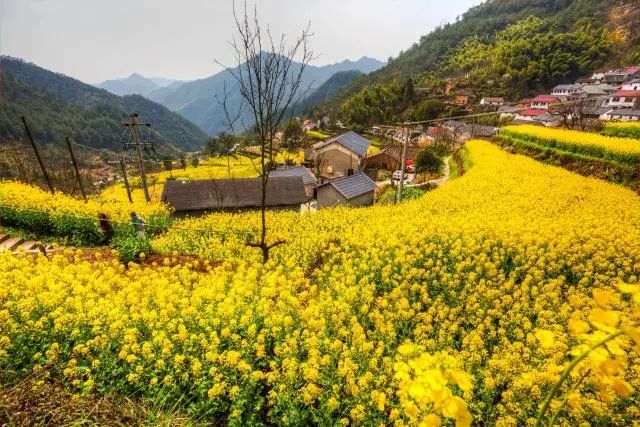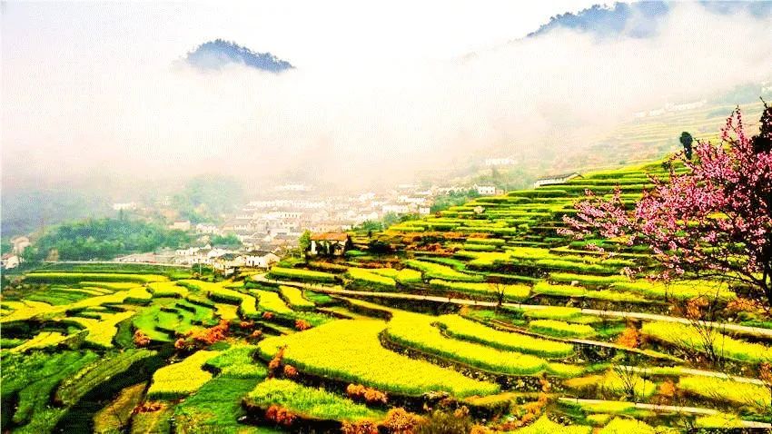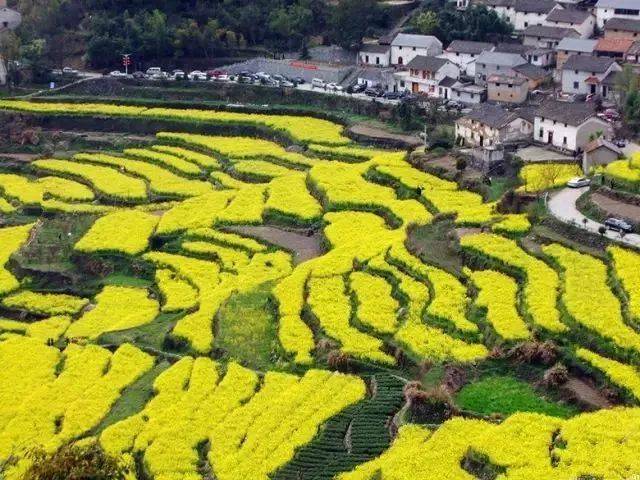 春天来的时候,层层叠叠的梯田里铺满金黄的油菜花,在古朴的民居和几百年古樟的衬托下,景色耀眼迷人,加上三、二株梨花和四、五株桃花的点缀,犹如一幅完美无瑕的水彩画。