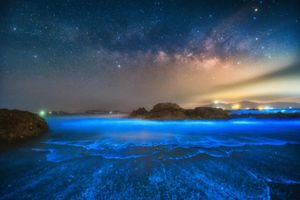 蓝眼泪的爆发季是每年的5-6月,且发生在海水清澈的海域,南风天及涨潮时分出现几率更大。