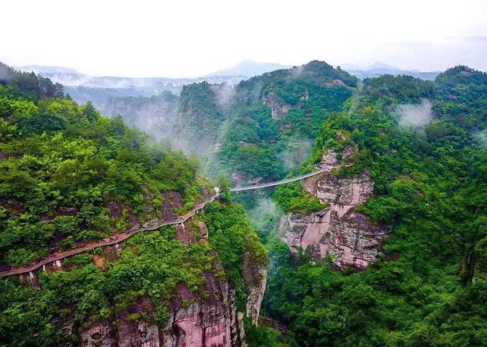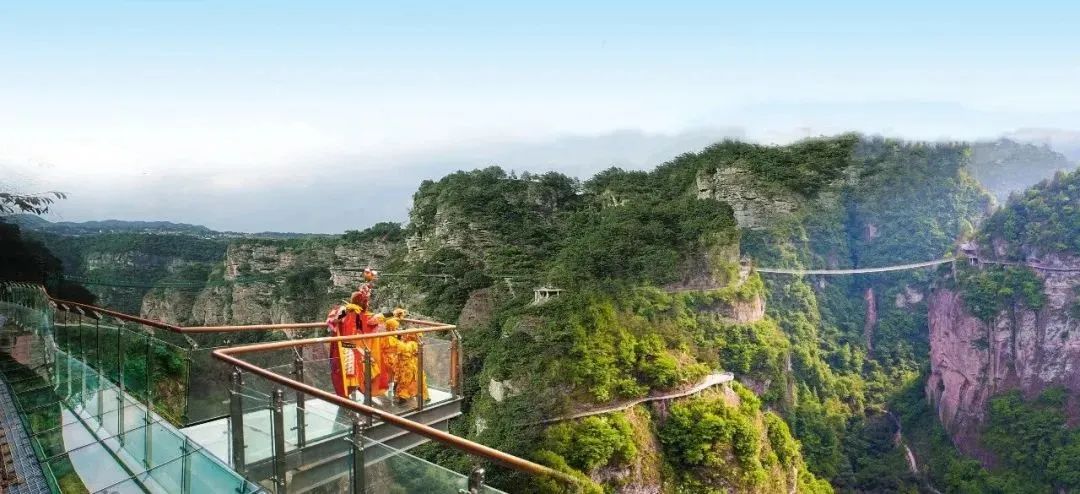 飞龙栈道——依山势而造,曲折盘旋二十余处山坳,总长达5000米。既似飞龙在天,又如云龙盘山,透过玻璃能看到垂直的山体,非常惊险刺激!