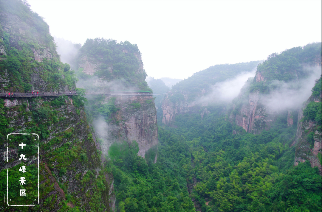 十九峰里有一峡谷,有着壮观的丹霞地貌,由十九峰、台头山两组丹霞地貌相峙而成。这里作为《笑傲江湖》、《射雕英雄传》、《少林武王》、《天龙八部》的外景地而名闻全国。